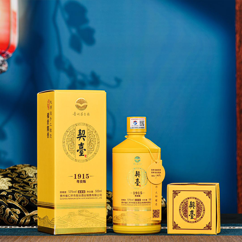 [契台酒1915尊贵版]是我厂深度研发的一款品牌,经过国家高级调酒师精心把关研制,产自茅台镇酱酒核心产区酿造-精心选粮-赤水河水-精心酿造-35道工序-165个工艺环节-国家执行标准检验出厂,采用本地有机糯高粱、小麦为原料、传承茅台12987工艺。属于柔和酱香型白酒,更适合大部分地区客户口感,具有入口绵,回味甜等特点。